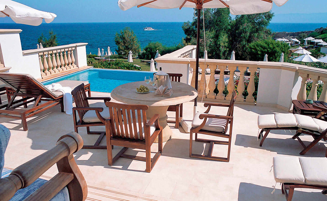 Das idyllisch-ruhige Luxusresort Anassa liegt an einem der schönsten Strände im Nordwesten Zyperns und verströmt mediterranen Charme in seiner reinsten Form. Die Anlage, inspiriert von traditionellen Dörfern, fügt sich mit ihrem kleinen Dorfplatz, der Kapelle und dem prächtigen Garten harmonisch in die malerische Landschaft ein. Sanfte Naturfarben, helle Marmorböden und edle Holzmöbel schaffen ein elegantes, zugleich warmes Ambiente. Besonders beeindruckend sind die zwei großzügigen Pools, von denen einer sich über drei Ebenen in die Umgebung schmiegt. Im großzügigen Spa-Bereich finden Gäste Ruhe und Erholung: Hallenschwimmbad, Jacuzzi, Sauna und Dampfbad laden zum Entspannen ein. Ergänzt wird das Angebot durch ein modernes Gym sowie Tennis- und Squashplätze, die Aktivität und Wellness perfekt vereinen.