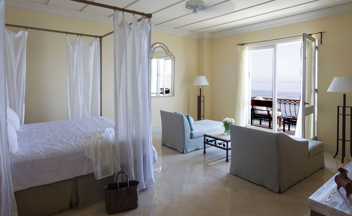 166 Zimmer, Suiten und Villen. Alle mit Meerblick, sehr elegant und luxuriös eingerichtet mit mediterranem Flair, Terrasse oder Balkon, Bad, TV, Minibar, Safe.