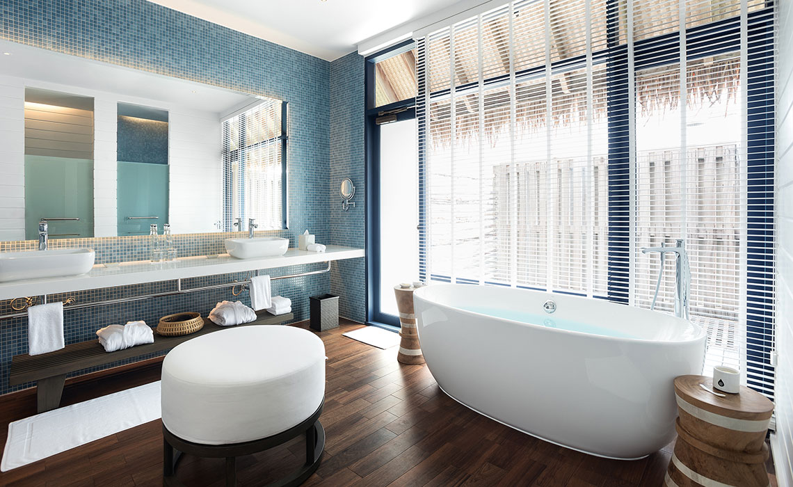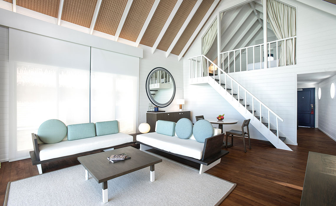 Dhoni-Villa: geschmackvoll eingerichtet in hellen naturverbundenen Farben mit TV, Bose-Lautsprecher-System, Minibar, Safe, Sitzecke und schöner Außenterrasse.