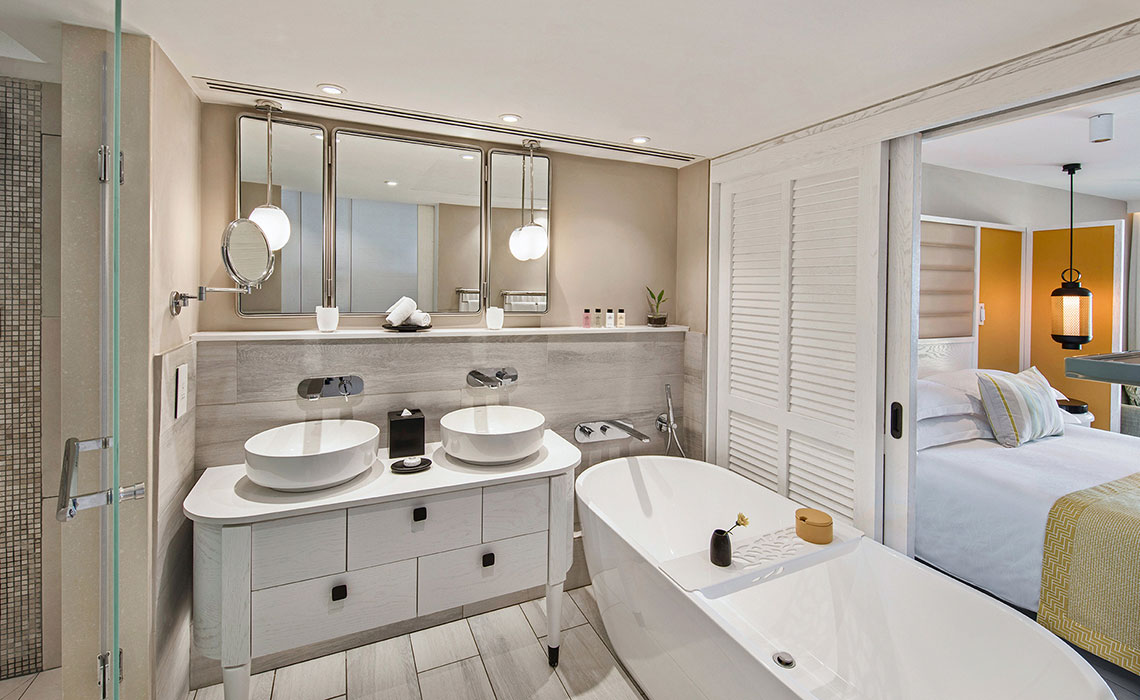 Alle Zimmer mit Balkon oder Terrasse zur Meerseite ausgerichtet; für die Einrichtung wurden einheimische Hölzer, Marmor und Stoffe in frischen Farben verwendet. Satelliten-TV, Bad mit Badewanne und Dusche, Minibar, Apple Mac Mini-Entertainment-System, Nespresso-Maschine.