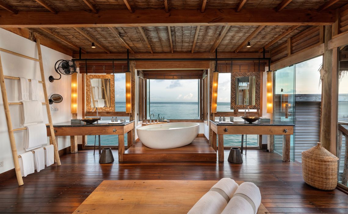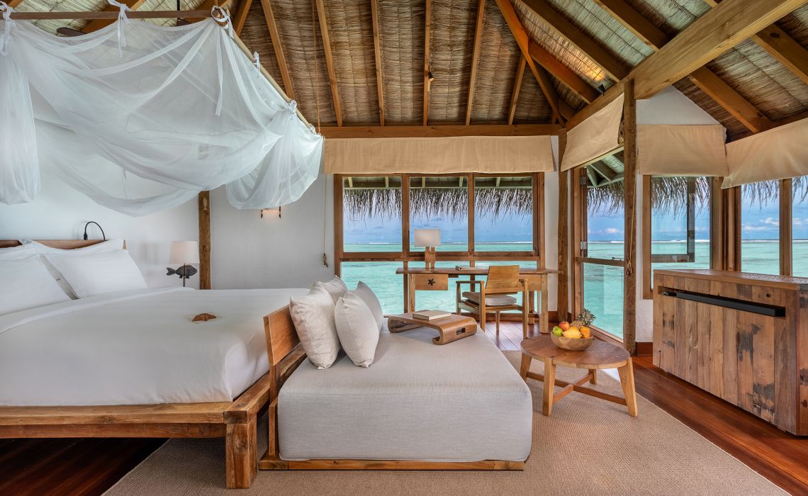 45 Villen, nur Wasservillen auf Stelzen (ab 210 qm), geschmackvoll und edel eingerichtet mit großem Designer-Bad, offener Dusche, Safe, Minibar, TV, CD.