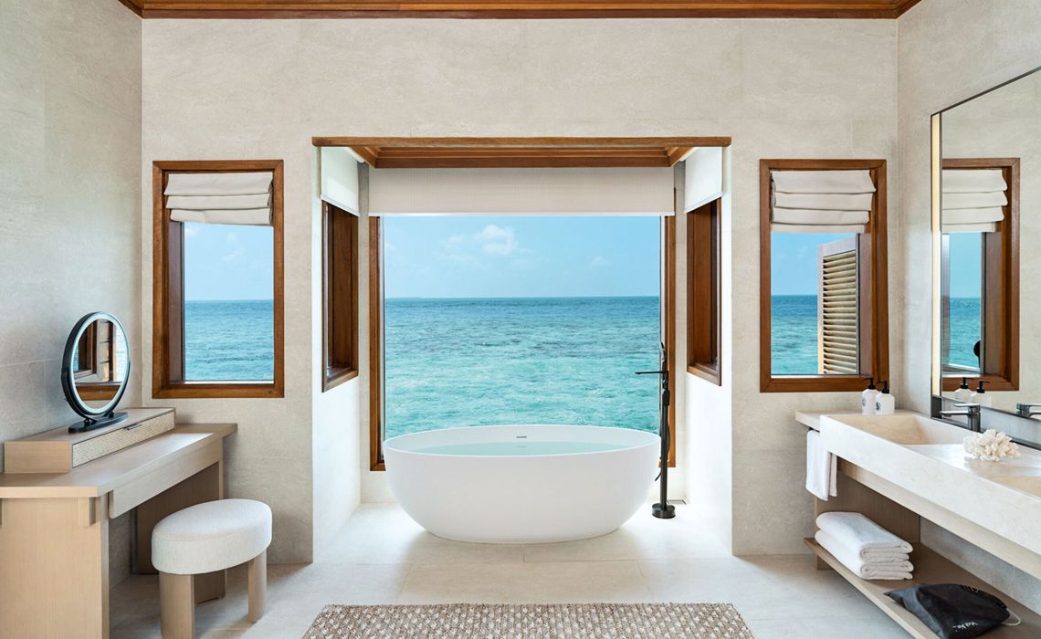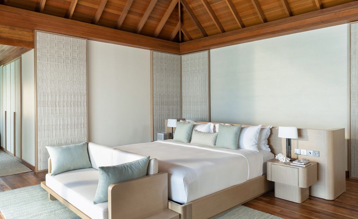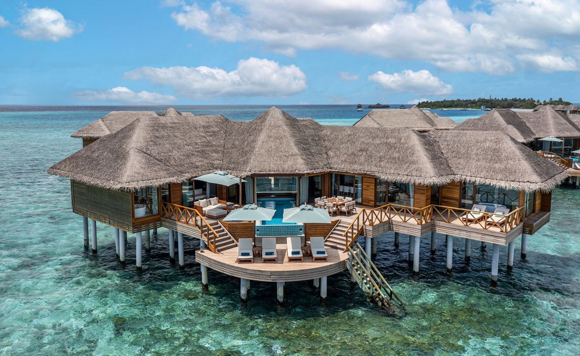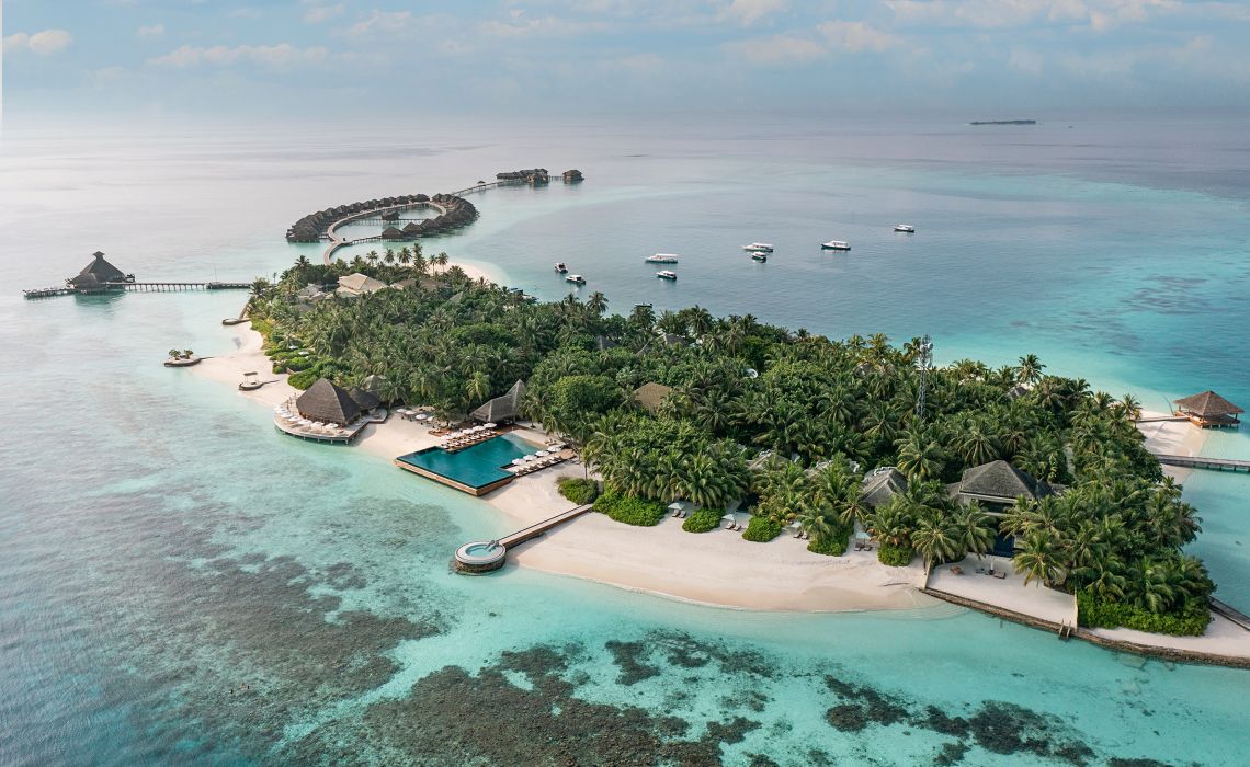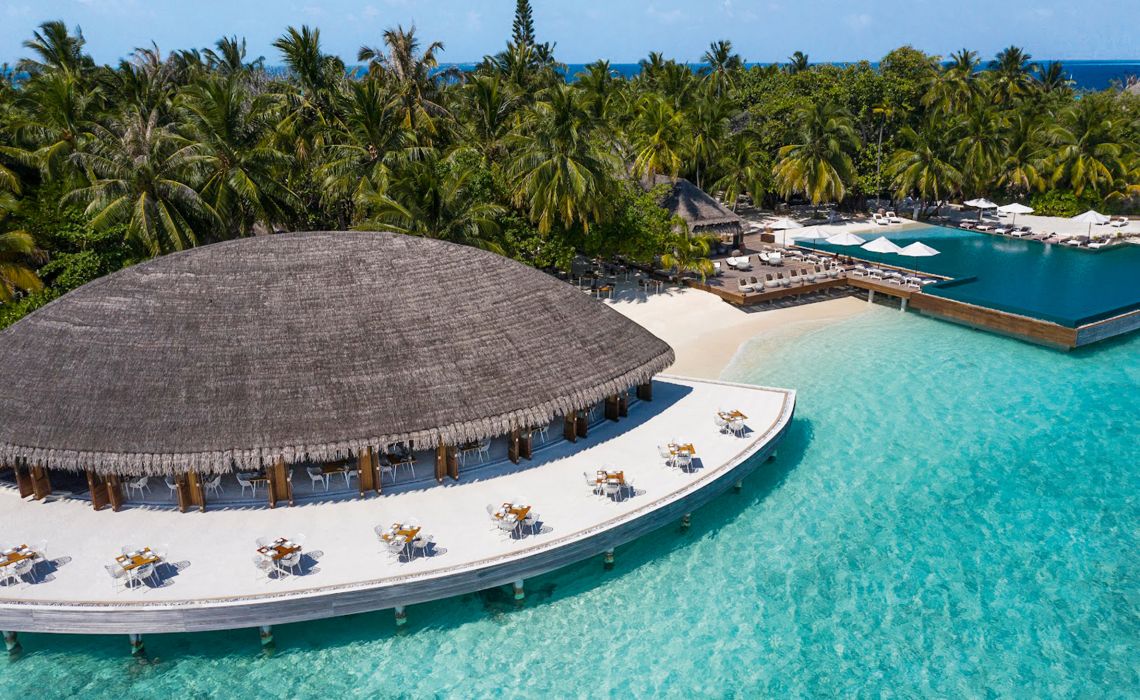 Nur eine 30-minütige Bootsfahrt durch das unglaubliche Farbspektrum ständig wechselnder Türkistöne trennt den oft lauten und stressigen Flughafen von der großartigen Ruhe dieser im Nord-MaleAtoll schwimmenden Anlage. Egal, für welchen der 46 weitläufigen Bungalows und Pavillons man sich entscheidet – mit ihren mindestens 130 qm, dem unvergleichbaren Meerblick, den kaskadenartigen Außenduschen und schönen Sonnendecks mit Plunge-Pool bieten sie den Gästen genügend Platz und Annehmlichkeiten, um den ganzen Tag hier zu verbummeln. Zumal ein Butler für jeden denkbaren Wunsch zur Stelle ist, und sei es nur, um eine Flasche Wein aus der eigenen Hausbar zu entkorken. Allerdings: Jenseits des privaten Reichs gibt es auch einiges zu entdecken. Unter anderem den fantastischen Infinity-Pool, der so raffiniert gekachelt ist, dass er farblich perfekt zum Meer passt. Diverse Restaurants, die von lateinamerikanisch inspirierter japanischer Küche über Holzofen-Pizza bis zu organischer Gesundheitskost für jeden Geschmack das Richtige auf der Menükarte haben. Und ein völlig zu Recht gehyptes Unterwasser-Spa – man denke nur an private Yoga-Sitzungen, bei denen ein ausgestreckter Oktopus vorbeischwebt. Dazu kommt natürlich das Meer in echt, jenseits der Glaswand – ein kristallklarer Kosmos, den es zu entdecken gilt.