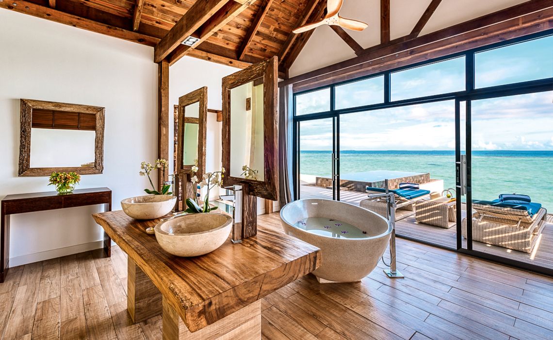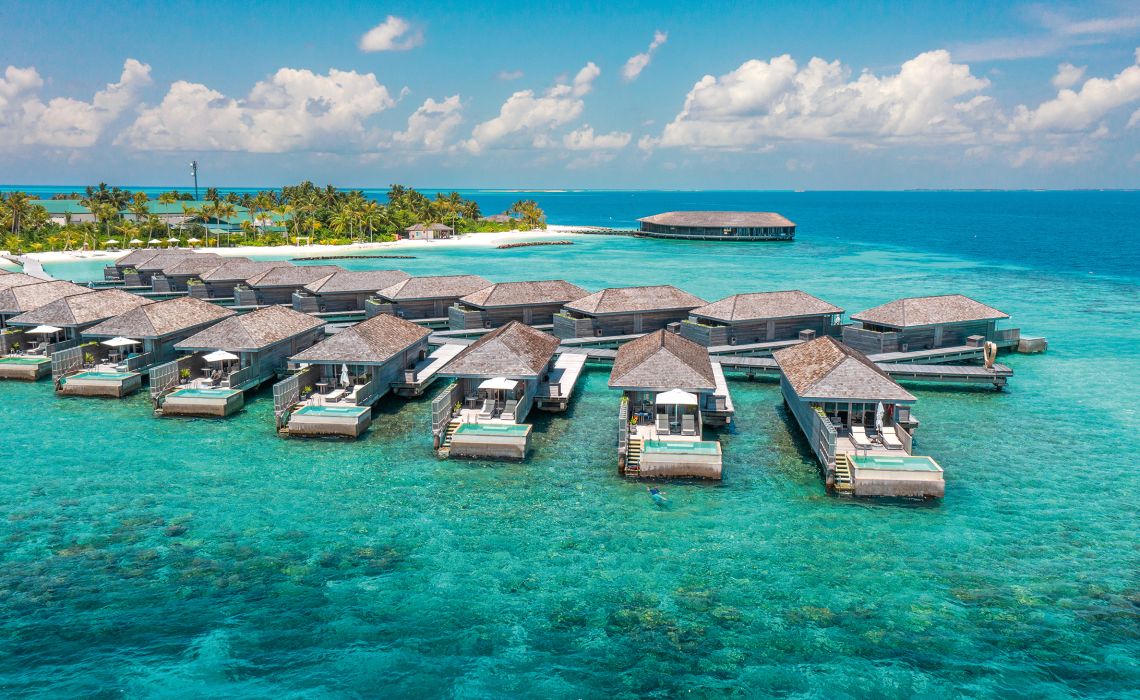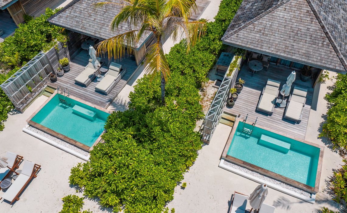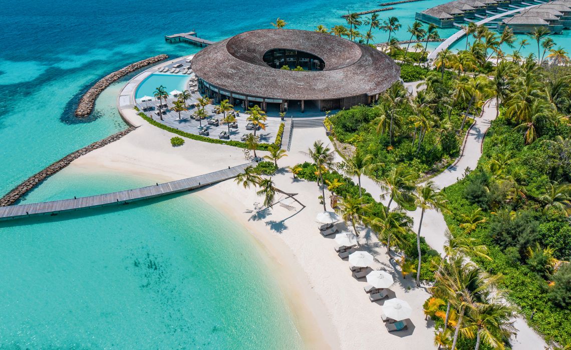 Die abgeschiedene Lage macht diese Insel zu etwas Besonderem. Auf dem sandigen Zipfel am Rand des Nord-Male-Atolls herrscht pures Barfuß-Luxusglück – viele Gäste lassen schon an der Rezeption die Schuhe stehen. Die 50 Strand- und Overwater-Villen überzeugen mit schlichter Eleganz, natürlichen Materialien und fließendem Übergang zwischen drinnen und draußen: Open-Air-Bad und -Dusche, Sonnendeck mit Pool und direktem Zugang zum Meer sowie Zimmer mit versenkbaren Glastüren und freiem Blick auf den Ozean. Highlight ist der Baani Spa Complex – eine UFO-artige Holzkonstruktion über dem Wasser mit Fitnessstudio, Behandlungsräumen und einem Restaurant rund um ein luftiges Open-Air-Zentrum.