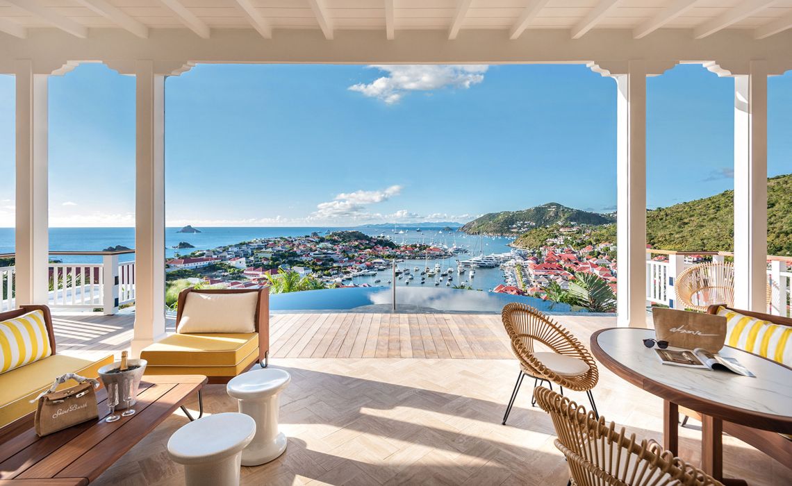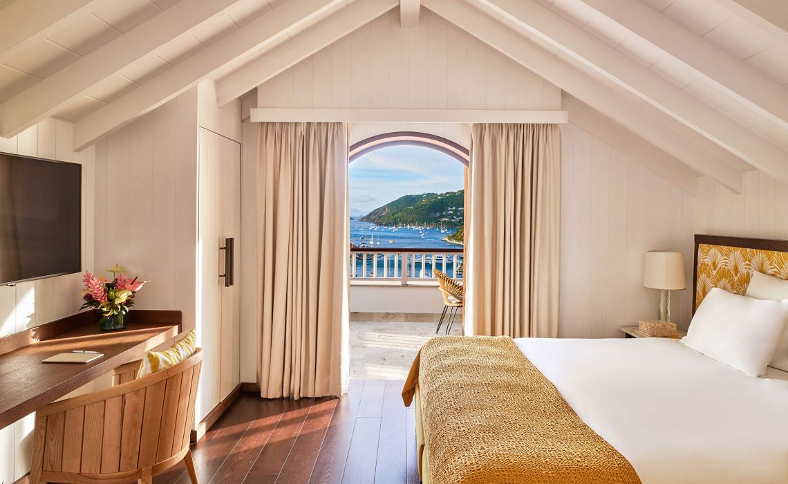 Alle mit schönem Panoramablick über Gustavia hinweg Richtung Ozean und Sonnenuntergang, mit separatem Wohnraum, Innen- und Außendusche, Terrasse, Safe, TV, Minibar.