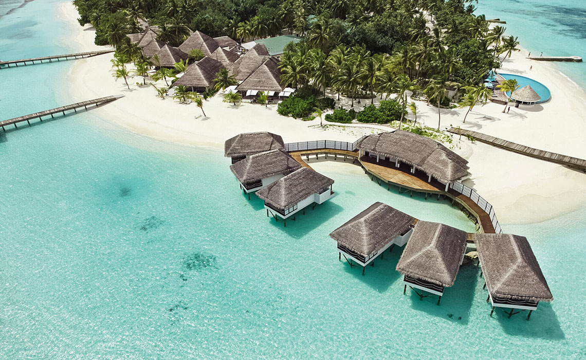 Es gibt 1.200 Malediven-Inseln, die meisten davon sind unberührt. Nur knapp 200 sind bewohnt, entweder von der einheimischen Bevölkerung oder von Urlaubsgästen, die hier ihren Südseetraum ausleben, obwohl sie nicht in der Südsee sind. Die ist viel weiter weg, aber optisch vergleichbar: Beim Anflug aus der Luft wirkt es, als habe Frau Holle ihr Kissen geschüttelt, nur dass anstelle von Federn Inseln in die Tiefe fielen. Dort schwimmen sie nun im türkisblauen Indischen Ozean. Ihr Kern ist dschungelgrün, ihre Ränder sind sandweiß und an langen Stegen, die wie schlanke Insektenbeine über das Wasser führen, reihen sich Häuschen, die sich aus der Nähe betrachtet als meist luxuriöse, großzügige Gäste-Bungalows entpuppen. In der Regel gilt: eine Insel, ein Hotel. In vielen davon wird Privacy zelebriert, in anderen auch öfter gefeiert. Breit gefächerte Wassersportmöglichkeiten, schöne Spas und diverse Restaurants bieten Abwechslung – doch eigentlich braucht man sie nicht. Die Aussicht von der eigenen Terrasse auf das Meer und die Privatleiter ins Wasser reichen, um wunschlos glücklich zu sein. So kommen Freunde ungestörter Einsamkeit ebenso auf ihre Kosten wie all jene, die Unterhaltung, Sport, Gourmet-Dining und Luxus suchen.