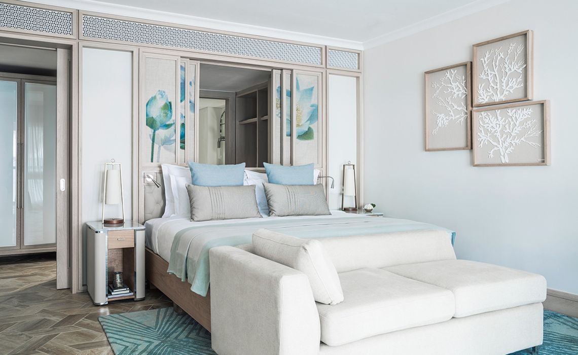 142 Zimmer. Großzügig und geschmackvoll eingerichtet in hellen Farben, großes Badezimmer mit Tropendusche, Minibar, Safe, Terrasse oder Balkon, Blick je nach Kategorie Richtung Lagune (Sunset) oder Meer, Butler-Service (nur in Suiten).