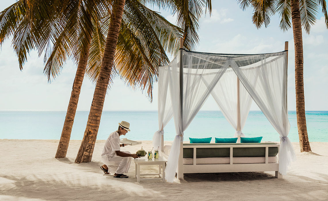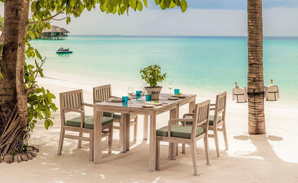 Es gibt 1.200 Malediven-Inseln, die meisten davon sind unberührt. Nur knapp 200 sind bewohnt, entweder von der einheimischen Bevölkerung oder von Urlaubsgästen, die hier ihren Südseetraum ausleben, obwohl sie nicht in der Südsee sind. Die ist viel weiter weg, aber optisch vergleichbar: Beim Anflug aus der Luft wirkt es, als habe Frau Holle ihr Kissen geschüttelt, nur dass anstelle von Federn Inseln in die Tiefe fielen. Dort schwimmen sie nun im türkisblauen Indischen Ozean. Ihr Kern ist dschungelgrün, ihre Ränder sind sandweiß und an langen Stegen, die wie schlanke Insektenbeine über das Wasser führen, reihen sich Häuschen, die sich aus der Nähe betrachtet als meist luxuriöse, großzügige Gäste-Bungalows entpuppen. In der Regel gilt: eine Insel, ein Hotel. In vielen davon wird Privacy zelebriert, in anderen auch öfter gefeiert. Breit gefächerte Wassersportmöglichkeiten, schöne Spas und diverse Restaurants bieten Abwechslung – doch eigentlich braucht man sie nicht. Die Aussicht von der eigenen Terrasse auf das Meer und die Privatleiter ins Wasser reichen, um wunschlos glücklich zu sein. So kommen Freunde ungestörter Einsamkeit ebenso auf ihre Kosten wie all jene, die Unterhaltung, Sport, Gourmet-Dining und Luxus suchen.