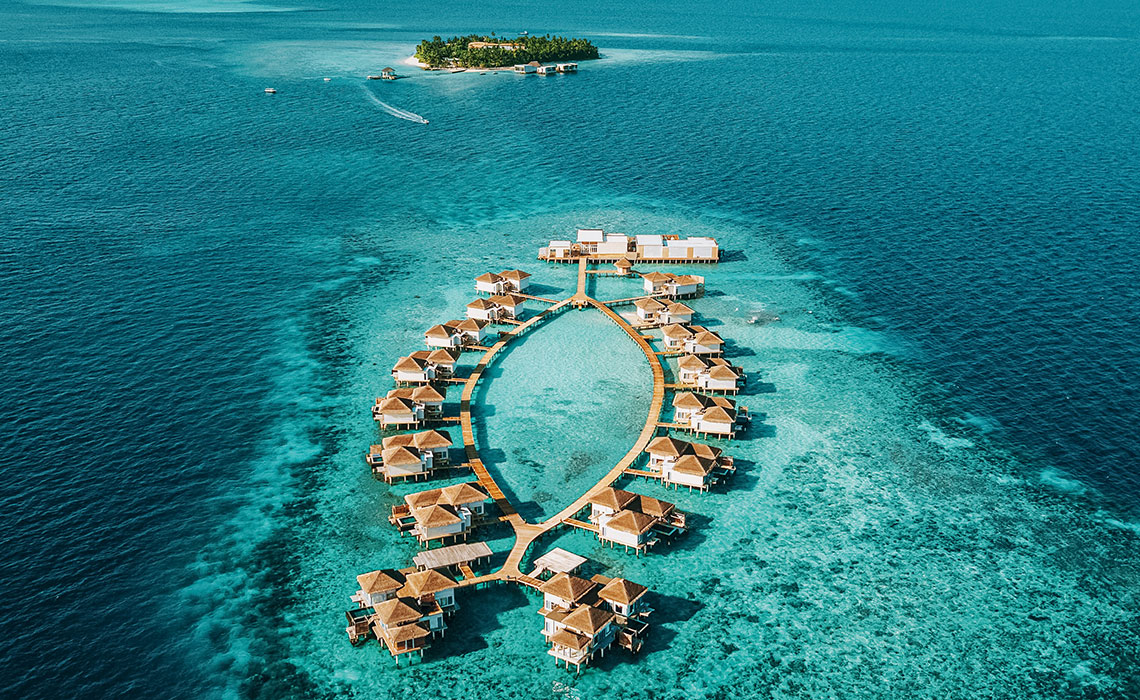 Es gibt 1.200 Malediven-Inseln, die meisten davon sind unberührt. Nur knapp 200 sind bewohnt, entweder von der einheimischen Bevölkerung oder von Urlaubsgästen, die hier ihren Südseetraum ausleben, obwohl sie nicht in der Südsee sind. Die ist viel weiter weg, aber optisch vergleichbar: Beim Anflug aus der Luft wirkt es, als habe Frau Holle ihr Kissen geschüttelt, nur dass anstelle von Federn Inseln in die Tiefe fielen. Dort schwimmen sie nun im türkisblauen Indischen Ozean. Ihr Kern ist dschungelgrün, ihre Ränder sind sandweiß und an langen Stegen, die wie schlanke Insektenbeine über das Wasser führen, reihen sich Häuschen, die sich aus der Nähe betrachtet als meist luxuriöse, großzügige Gäste-Bungalows entpuppen. In der Regel gilt: eine Insel, ein Hotel. In vielen davon wird Privacy zelebriert, in anderen auch öfter gefeiert. Breit gefächerte Wassersportmöglichkeiten, schöne Spas und diverse Restaurants bieten Abwechslung – doch eigentlich braucht man sie nicht. Die Aussicht von der eigenen Terrasse auf das Meer und die Privatleiter ins Wasser reichen, um wunschlos glücklich zu sein. So kommen Freunde ungestörter Einsamkeit ebenso auf ihre Kosten wie all jene, die Unterhaltung, Sport, Gourmet-Dining und Luxus suchen.