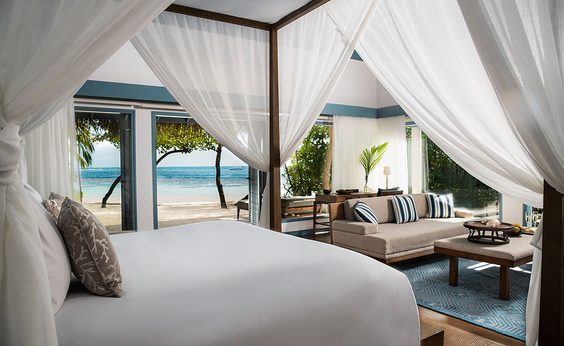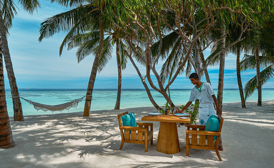 Es gibt Orte, an die man wirklich wollen muss. Die Malediven sind zwar problemlos zu erreichen, aber manche Inseln sind es nicht. Zu diesen gehört Meradhoo, ein abgeschiedenes Eiland im tiefen Süden des Inselreiches. Von Male aus fliegt man eine knappe Stunde, danach sind noch 15 Speedboat-Minuten notwendig, um die abgelegene Insel im Gaafu-Alifu-Atoll zu erreichen. Dort befindet sich das Raffles Maldives Meradhoo Resort mit 22 Insel- und 16 Überwasser-Villen, allesamt mit eigenen Terrassen und Privatpools versehen. Zudem stehen drei Restaurants, eine Cocktailbar sowie ein Reigen an Freizeit- und Entspannungsmöglichkeiten für Körper, Geist und Seele zur Verfügung. Das luxuriöse Spa und das über dem Wasser schwebende Fitness-Center bieten neben Yoga und Pilates jede Menge Wassersportoptionen und ein PADI-zertifiziertes Tauchzentrum, dessen Team es auch Anfängern ermöglicht, eines der weltweit schönsten Tauchgebiete zu erkunden. Um sämtliche Aktivitäten zu organisieren und zu koordinieren, stehen 24-Stunden-Butler zur Verfügung, auch individuell arrangierte Dinner mit privatem Küchenchef auf der eigenen Terrasse sind möglich. Allein dafür lohnt es sich, ein Stückchen weiter zu reisen.