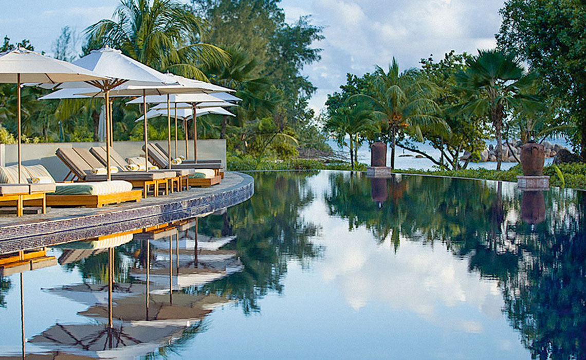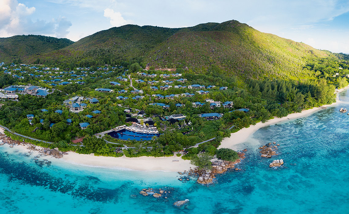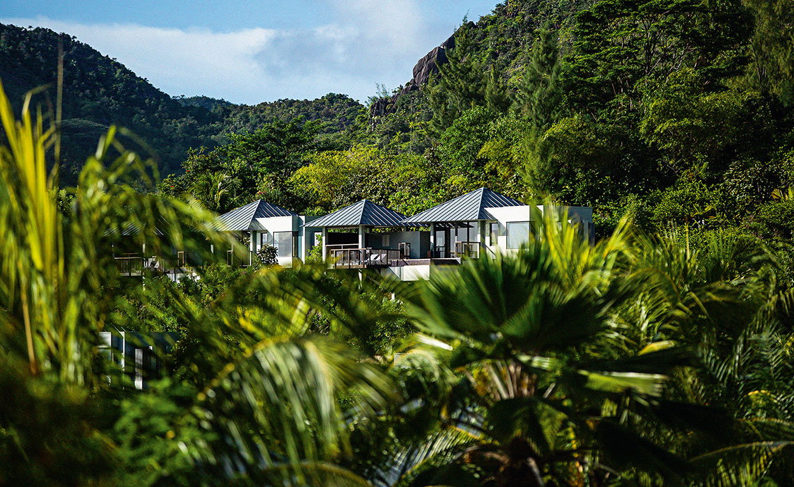 Einige Einheimische mögen die urban-elegante Architektur des Raffles Hotels auf Praslin mit Verwunderung betrachten – doch Gäste sind begeistert. Die luxuriösen Villen sind großzügig geschnitten, modern und mit viel Liebe zum Detail gestaltet. Private Pools, Sonnenterrassen, Außenduschen und ein Butler auf Abruf lassen keine Wünsche offen. Das Design ist international, aber entspannt – perfekt für Reisende, die zwischen New York und Hongkong pendeln. Viele der 87 Villen bieten dank Hanglage einen atemberaubenden Blick auf die Bucht Anse Takamaka mit ihrem puderzuckerweißen Strand, Granitfelsen und glasklarem Meer. Nicht selten begegnet man einer Riesenschildkröte – auf der nahe gelegenen Insel Curieuse leben über 500 Exemplare. Wer Lust auf Schnorcheln oder Tauchen hat, wird auf La Digue fündig. Die meisten Gäste aber bleiben im Raffles – nicht zuletzt wegen der hervorragenden Küche: modern-kreolisch im Restaurant Losean, asiatisch-exquisit im Curieuse. Zum Aperitif trifft man sich stilvoll in der Danzil Lounge, danach locken Cocktails und Wasserpfeifen in der Bar – und ein spektakulärer Sternenhimmel als Zugabe.