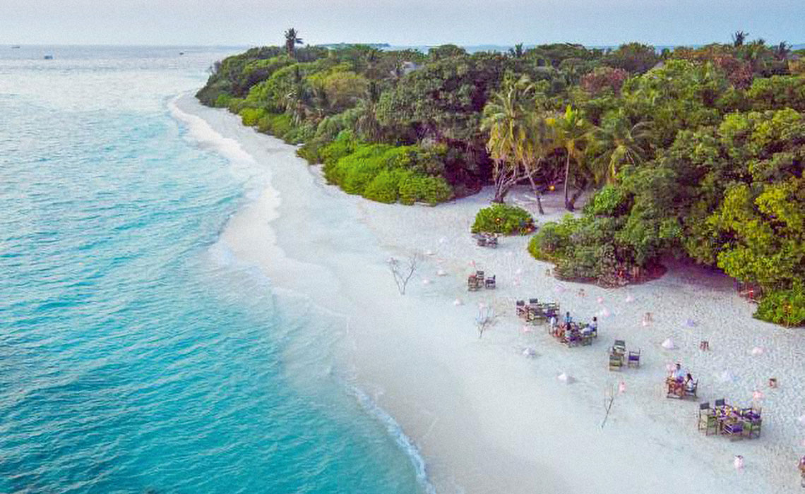 Es gibt 1.200 Malediven-Inseln, die meisten davon sind unberührt. Nur knapp 200 sind bewohnt, entweder von der einheimischen Bevölkerung oder von Urlaubsgästen, die hier ihren Südseetraum ausleben, obwohl sie nicht in der Südsee sind. Die ist viel weiter weg, aber optisch vergleichbar: Beim Anflug aus der Luft wirkt es, als habe Frau Holle ihr Kissen geschüttelt, nur dass anstelle von Federn Inseln in die Tiefe fielen. Dort schwimmen sie nun im türkisblauen Indischen Ozean. Ihr Kern ist dschungelgrün, ihre Ränder sind sandweiß und an langen Stegen, die wie schlanke Insektenbeine über das Wasser führen, reihen sich Häuschen, die sich aus der Nähe betrachtet als meist luxuriöse, großzügige Gäste-Bungalows entpuppen. In der Regel gilt: eine Insel, ein Hotel. In vielen davon wird Privacy zelebriert, in anderen auch öfter gefeiert. Breit gefächerte Wassersportmöglichkeiten, schöne Spas und diverse Restaurants bieten Abwechslung – doch eigentlich braucht man sie nicht. Die Aussicht von der eigenen Terrasse auf das Meer und die Privatleiter ins Wasser reichen, um wunschlos glücklich zu sein. So kommen Freunde ungestörter Einsamkeit ebenso auf ihre Kosten wie all jene, die Unterhaltung, Sport, Gourmet-Dining und Luxus suchen.