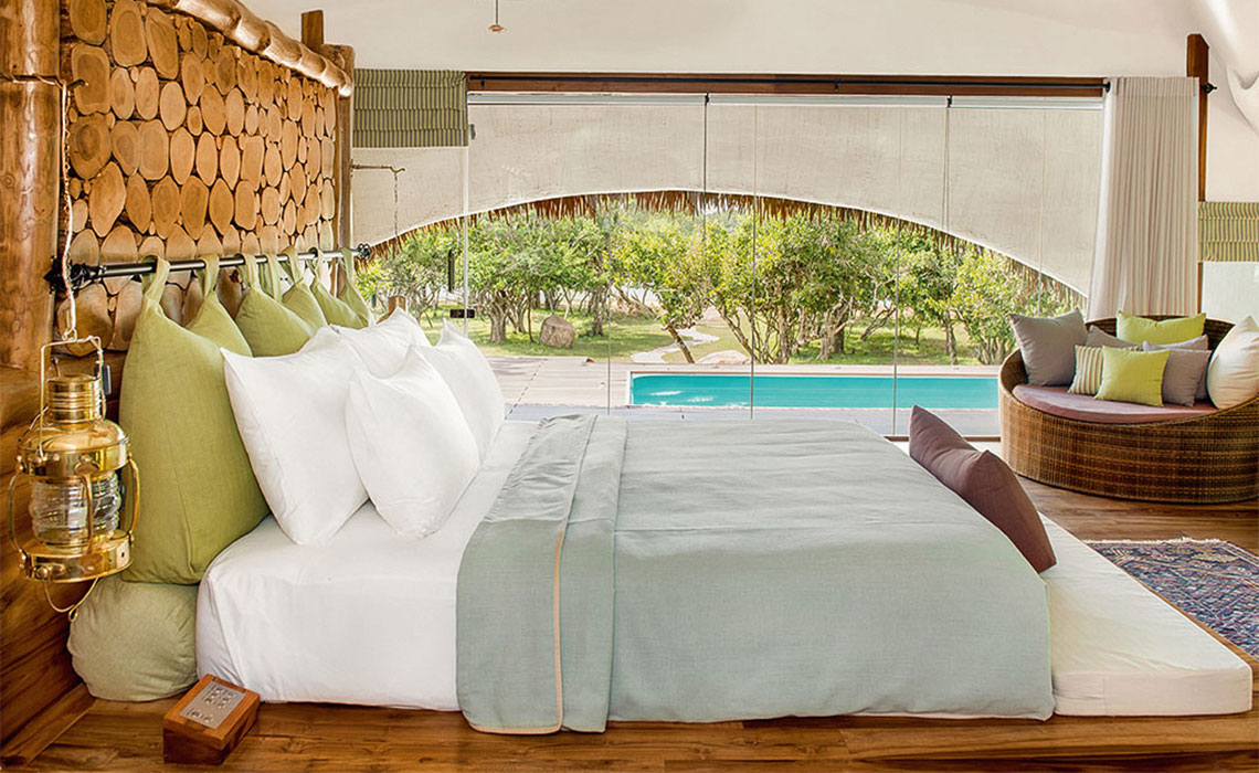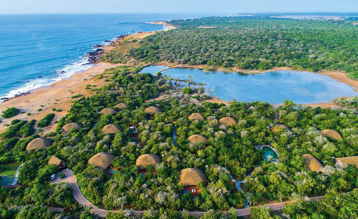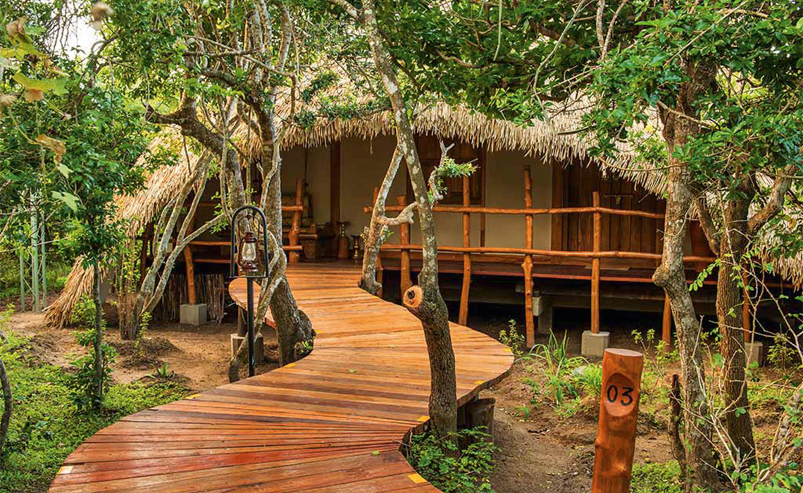 Aber gut: Die 14 in schickem Safaristil gestalteten „Hütten" stehen im Dschungelgrün oberhalb eines goldgelben Dünenstrands und in direkter Nachbarschaft zum Yala Nationalpark. Die Einfahrt zum Park ist zwar 10 Fahrminuten entfernt, aber Tiere kümmern sich nicht um Grenzen, weswegen Büffel, Wildschweine und gelegentlich auch Elefanten das Resort besuchen.