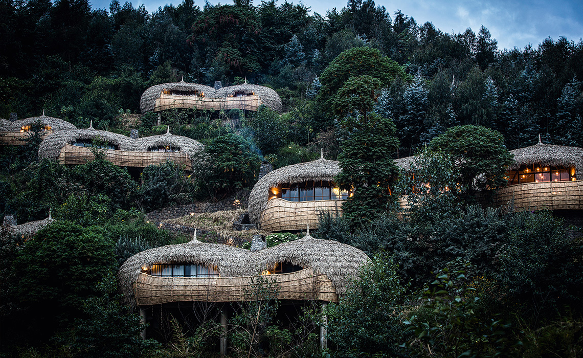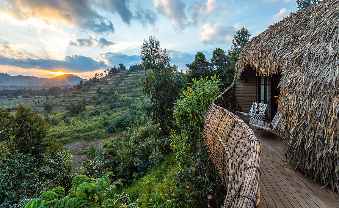 Spektakulär am Hang liegen die sechs von Wilderness Safari errichteten Buschvillen mit einem faszinierenden Blick auf die gegenüberliegenden Berge. Die Architektur ist den Palästen einheimischer Stammesfürsten nachempfunden: Von außen fügen sich die schilfgedeckten Rundhäuser perfekt in die bergige Umgebung ein, von innen präsentieren sie sich komfortabel und reich mit schönen lokaltypischen Webstoffen und Möbeln bestückt. Abgesehen von den vielen neuen Eindrücken, die man in Ruanda und bei den Berggorillas gewinnt, tut man durch den Aufenthalt in der Bisate Lodge auch der Umwelt etwas Gutes: 500 Bäume wurden gepflanzt, mehr sollen folgen.